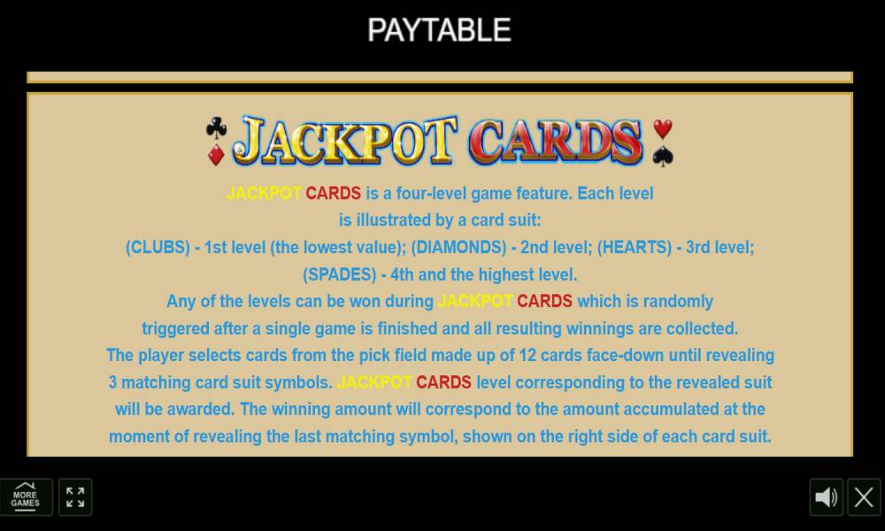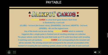 Jackpot Cards is a round in which the player is guaranteed a progressive jackpot. Its advantage is that the prize has no fixed size. With each passing second, the winnings grow. The jackpot stops at the moment of victory and is paid to the player, after which it resets. There are a total of four reward levels: 1 - clubs, 2 - diamonds, 3 - hearts, 4 - spades. To get one of the jackpots, it is necessary to find three cards of the corresponding suit. In total, the player is offered 12 of them, which must be turned over in turn. At the end of the round, the user will see how much money he got, it is a win-win game.