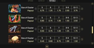 The slot machine uses the Cluster Wins mechanic with a cascade of signs. All winning combinations are removed from the field. In their place appear other symbols, but only those already present on the reels. The cascade ends when there are no more paying chains on the field or when all cells are filled with one symbol. The player receives the maximum reward for 25 symbols according to the pay table, and then can start the next spin.