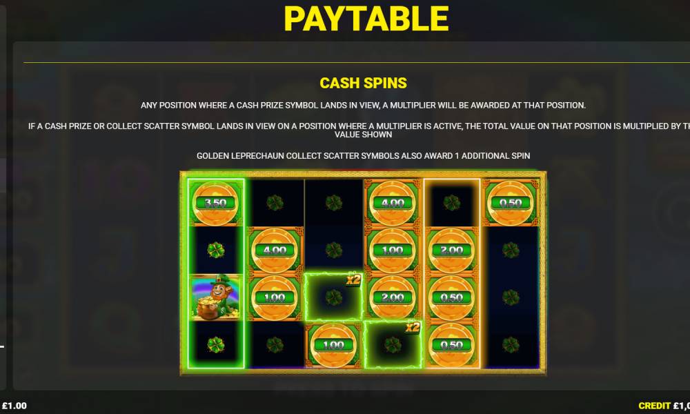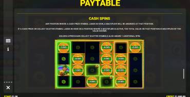 Cash Spins. The player is given 2 respins. Only cash symbols and collect signs will fall on the field. On some cells there are active additional multipliers. They increase the size of the bonus symbol. The Collect sign does not just absorb all the cash payouts, but also gives 1 respin. At the end of the round, the amount accumulated by the merry leprechaun is paid to the player.
