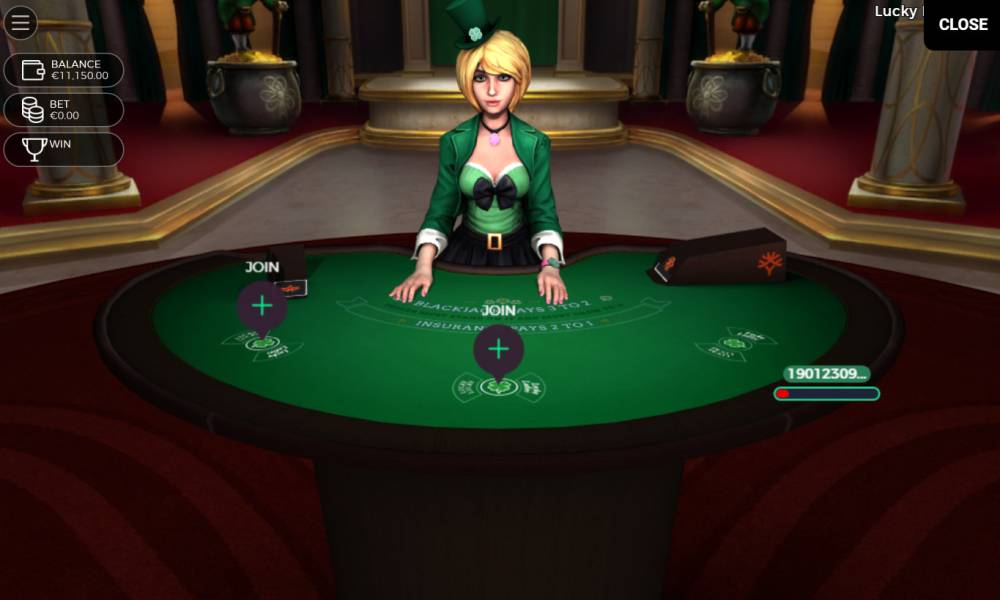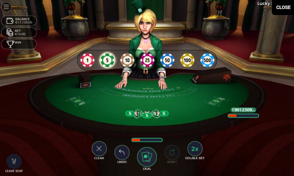 You will see a casino hall on the screen and a blackjack table between the columns. A dealer-girl in leprechaun costume serves here.
