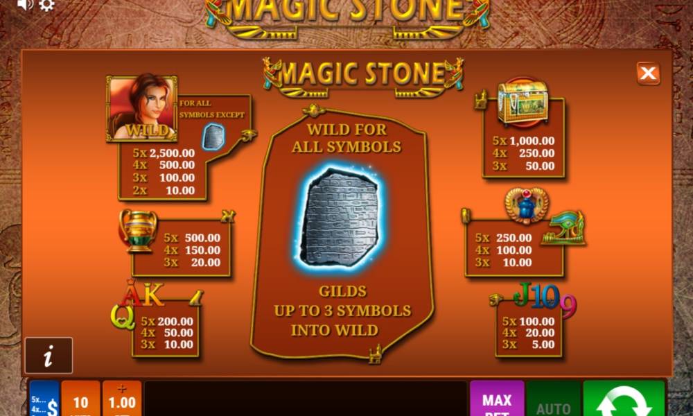 Playing on a five-reeled slot «Magic Stone» is possible by ten active lines only. The slot accepts same bets per each of the lines in range from one cent to two dollars. This way, the total bet per spin varies from ten cents to twenty dollars.