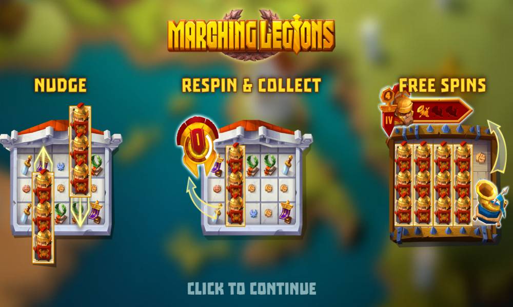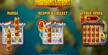 Marching Re-Spins. Starts in the case of simultaneous fall of the stacked Legionnaire symbol, i.e. in the amount of 3 units that occupy the entire reel. The stack becomes marching – with each spin, moves one step to the left. If additional Legionnaire stacks appear during the bonus respins, they also become marching stacks, continuing the series of re-spins. The round will last as long as at least 1 marching stack is present on the field.