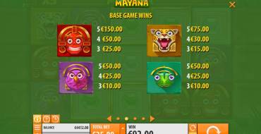 You would see four colorful diamonds and same number of masks at the screen of «Mayana». Same symbols may follow each other at the reels. Wilds, Scatters and bonus symbols are not provided by the rules of «Mayana» video slot. Pay table shows potential wins according to the current bet.