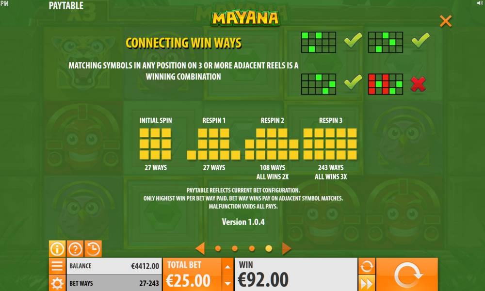«Mayana» video slot has five reels, but you can use only three of them in the beginning. Each reel fits three symbols. There are no active lines here. An amount of the bet per round is twenty five fold and varies in range from twenty five cents to one hundred euro. There are eight basic symbols in this slot. They form paid combinations at any cells of neighbor reels. Combinations can begin from any reel. Wins are calculated by special indexes from x4 to x150, provided by the rules for each of the possible combinations. They are multiplied by the coin value (1/25 of the total bet). In case of numerous combinations formed in result of a spin, all charged credits are summarized. Any paid combination triggers Expanding Respins. Details of respins and other bonus features of «Mayana» slot machine are carefully described below in the review by Casinoz.club. Number of possible payoffs varies from 27 to 243. It depends on how many symbols is displayed at the screen. There is no gambling feature here.