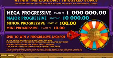 In Mega Moolah Isis, users compete for four accumulative jackpots. As usual, the amounts are raised by deductions from customer bets. The jackpots start with the following values: