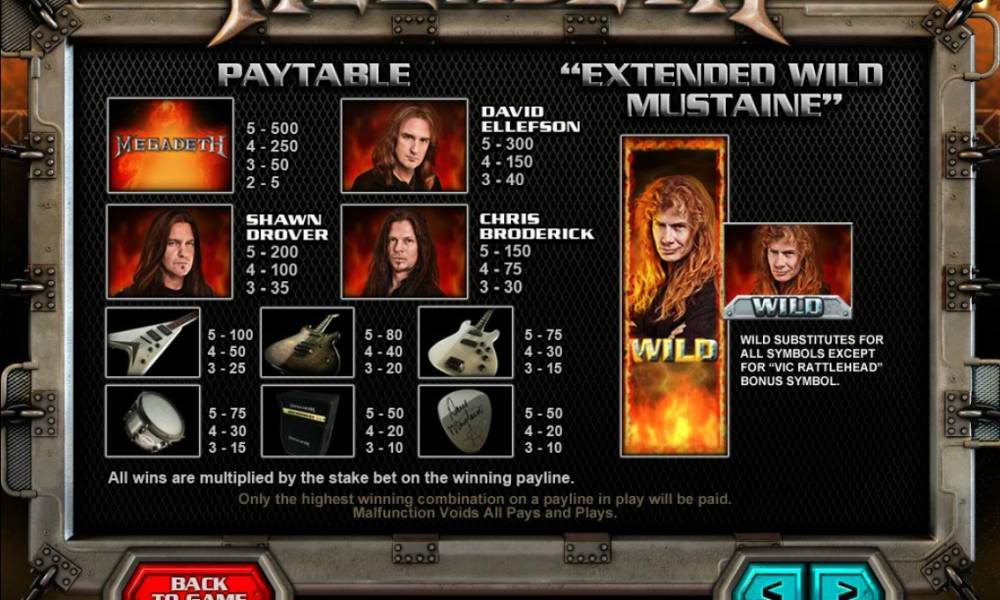 Megadeth video slot has five reels and forty instantly active lines. Playing this slot machine is possible by the bet in range from one cent to six euro per spin, this way, it is possible to stake up to two hundred forty euro per spin (by the example of Unibet Casino Black).