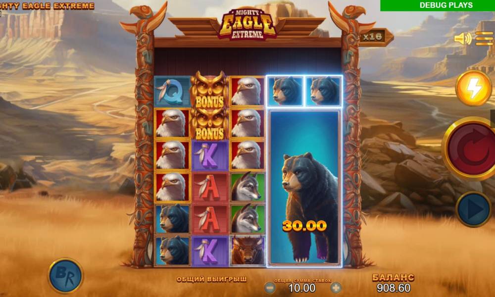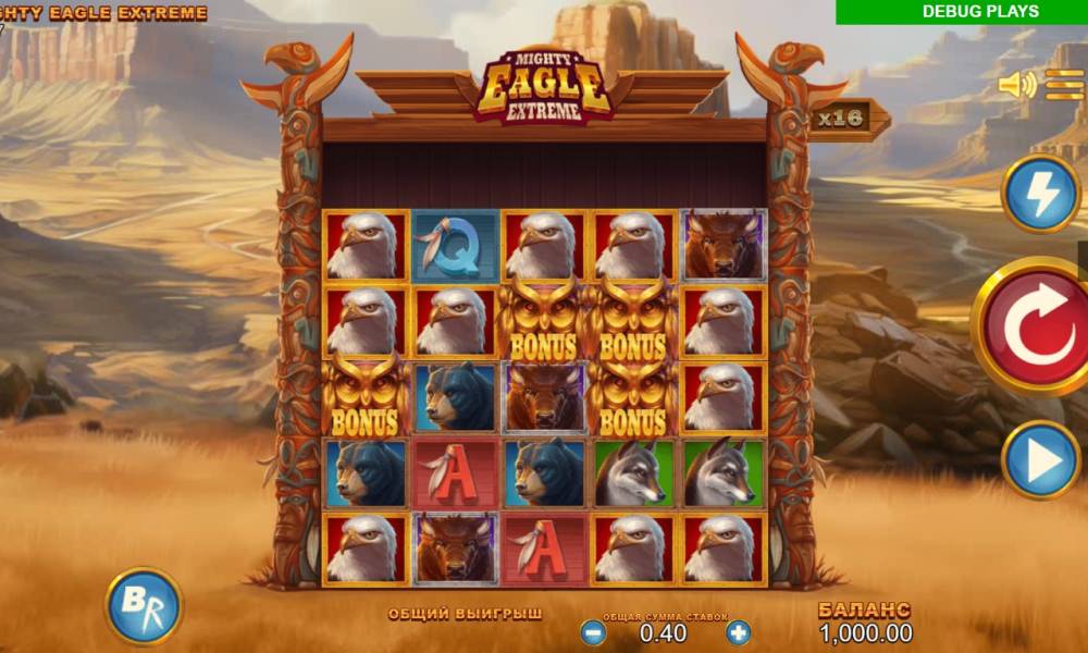 Mighty Eagle Extreme is a slot on the theme of the Wild West. The backdrop and the set of symbols are appropriate: behind the playing field there is a mountain canyon, and on the field the player will meet wild animals. The slot was released by Maltese studio Raw Igaming at the end of January 2024. It differs from the usual online slots in mechanics: here you need to collect not lines, but squares and rectangles of identical symbols. The set of bonus features is pleasantly impressive: there are cascades, increasing rows up, additional multipliers of several types, and free spins.