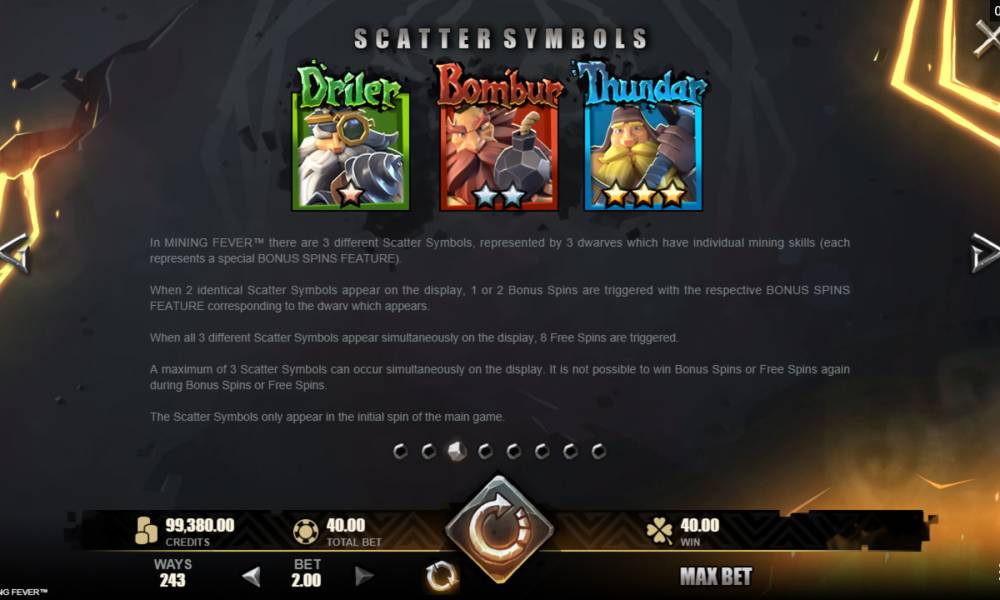 Mining Fever is a video slot that features 5 reels and 243 winning ways across a 15-symbol screen.