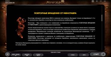 Bonus of repeated spins from the Minotaur. Activated when Wild appears on reels 2, 3 and 4. The symbol occupies the entire reel and starts new spins, with each subsequent spin increases the value of the multiplier. The round lasts until a winning combination is made. The value of the multiplier has no limit. The amount of winnings is calculated on the current bet. Repeated spins of each reel can be purchased. The largest payouts are given by the Wild symbol on the 4th reel.