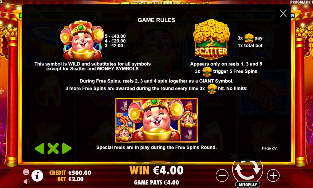 A gamble feature is not suggested, that means the sum of all payoffs goes to the customer's balance at the end of each round. Please read about special symbols and prize options of Money Mouse by Pragmatic Play below at Casinoz.club.