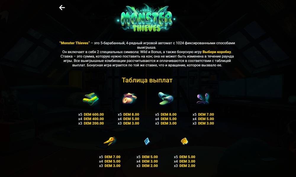 The Monster Thieves slot machine from the Mancala provider has a standard 5x4 playing field. Payouts are made on 1024 lines.