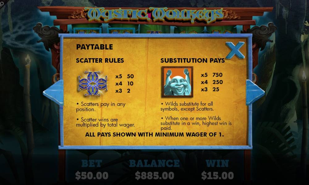 Mystic Monkeys is a free online slot machine with five reels, fifty pay lines and four rows of symbols at the screen. You can see twenty symbols at the screen as soon as the reels are stopped.