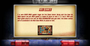 «The Ninja» is a new online slot machine available both for free testing and real game, which has five reels, twenty pay lines and three rows of symbols at the screen. Herewith, the customers can use any number of active lines from available quantity.