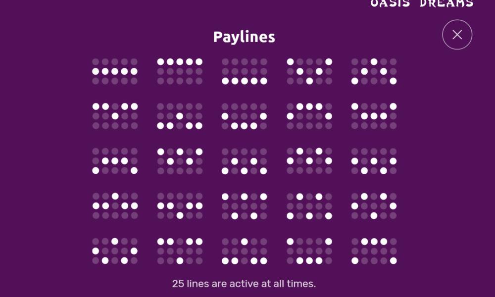 The Oasis Dreams slot is a game with five reels and 25 paylines. The playing field consists of 5 columns, each of which shows 3 symbols after the spin. Winning combinations are formed from left to right, starting from the first reel, and are counted only on the active lines. The betting range is from 0.25 to 125 coins for a single spins.