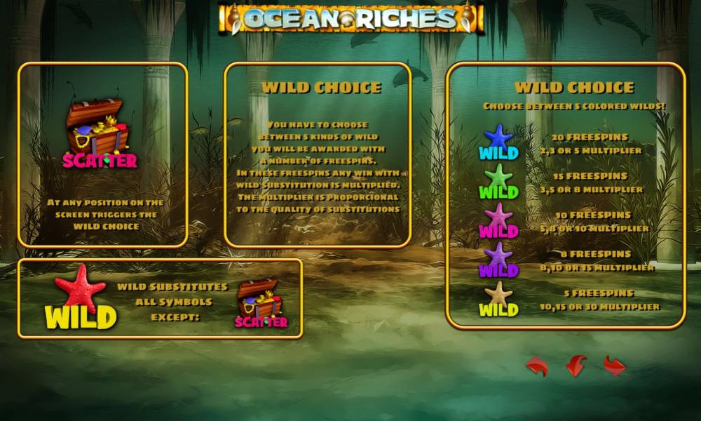 The bonus round of «Ocean Riches» video slot is free spins. Before the spins begin, you need to pick one of five kinds of Wilds. This is how you determine quantity of free spins and size of the extra multipliers. Please find details in the rules where you can find a detailed table. If you are interesting in the maximal number of spins, you should choose twenty round and x5 multiplier. If you prefer fighting for the maximal payoffs, you may choose five free spins with x30 multiplier. An amount of the bet remains the same, but it is placed by the casino during free spins.