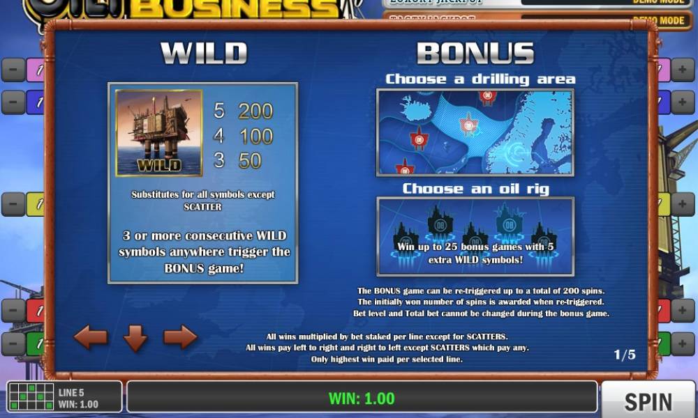 In the beginning of the prize round of «Oily Business» slot machine you would have to pick one of location at the map randomly and choose one of the available oil derricks. This way you find out quantity of free spins available to you, which can be prolonged up to two hundred spins.