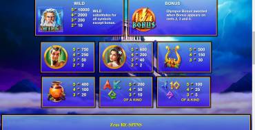 • Olympus Bonus – first, coins appear at new spin. You have to pick them randomly. Back side shows types of free spins. As soon as you collect three same coins, proper bonus begins.