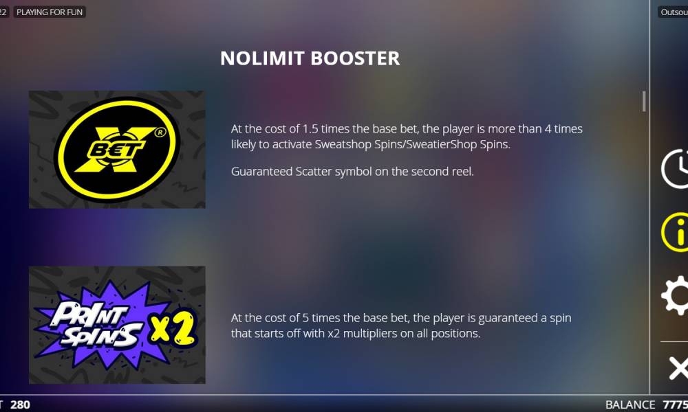 Sweatshop Spins. This round of free spins is activated when three Scatter symbols appear. For the duration of the bonus game, the multipliers earned are locked in place and held for all three turns.