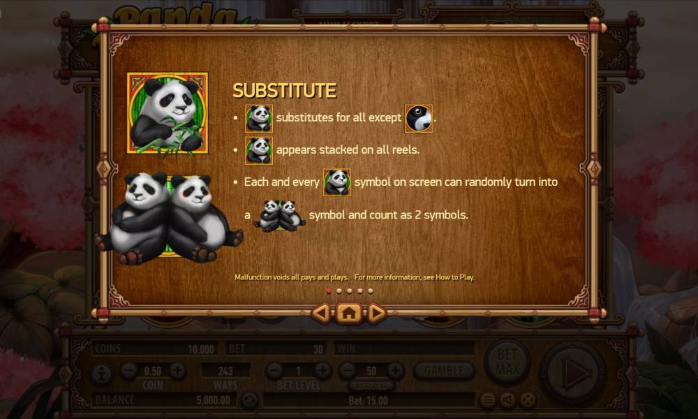 Wild (a panda) drops in vertical stacks at all five reels. This symbol forms winning combinations and replaces other ordinary symbols when necessary. Wild might turn double. In such situations it is taken as two symbols, that’s why number of symbols forming the combinations might reach ten for pandas and nine for other images.