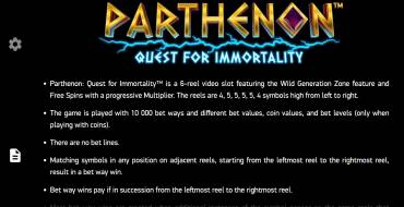 The field in the Parthenon: Quest for Immortality has a non-standard shape: it is divided into 6 reels and 5 rows. But the top row occupies only the reels from the 2nd to the 5th inclusive (that is, it includes 4 cells). It participates in a special feature with the generation of Wild. Payouts arrive without lines - for the appearance of identical symbols on at least 3 reels in a row, starting from the left one. Each payout triggers a cascade: winning signs are removed and new ones are dropped on their cells. A total of 10,000 combinations pay out.