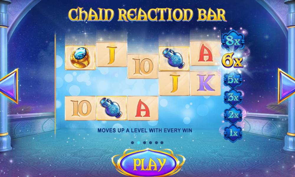 New round is launched by the button at the right. Except the manual mode, you can place automatic bets for a desired number of spins. So called Chain Reaction Bar is situated at the right of the reels. It displays active multipliers used in calculation of payoffs at the moment. It is possible to switch off the sound and set up the screen. There are no other user’s settings. It is not necessary to download «Persian Fortune» slot machine.