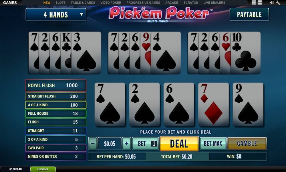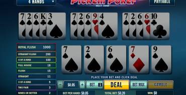 It is possible to play the video poker Pick'em on one, four, ten, twenty-five, fifty or one hundred lines.