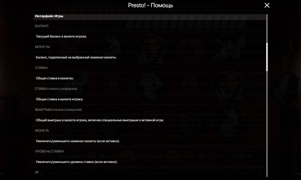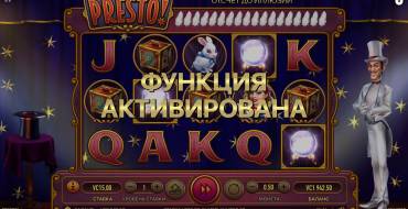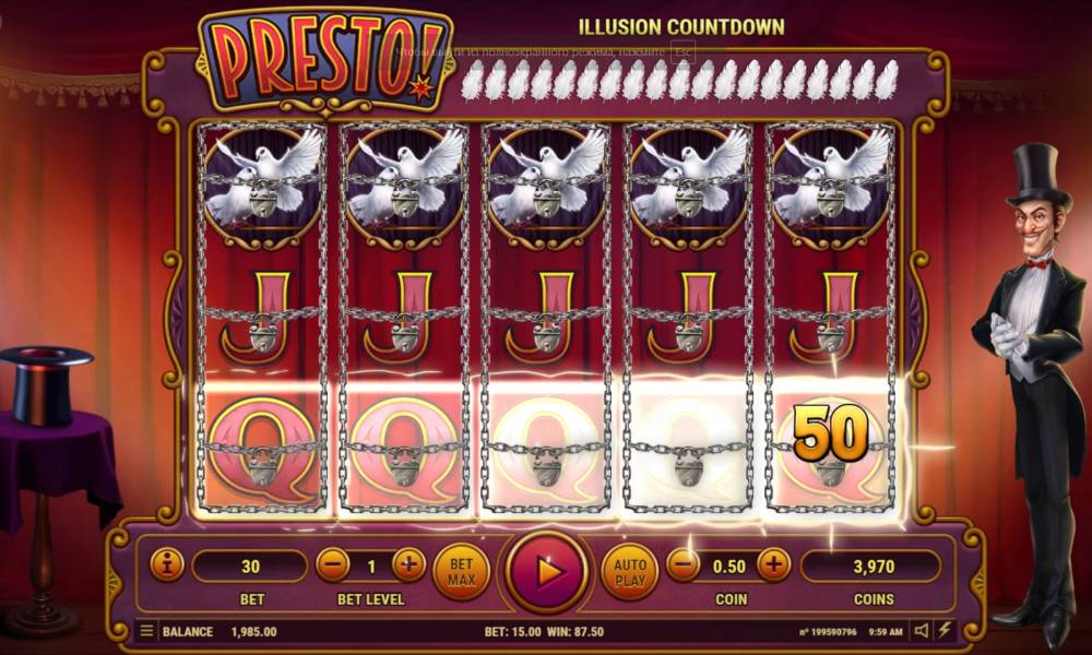 The Illusions prize feature system is involved in Presto. Five to twenty feathers are placed above the reels. With each spin, one feather flies away. When they run out, the illusionist presents a trick. He chooses it himself. The options are as follows: