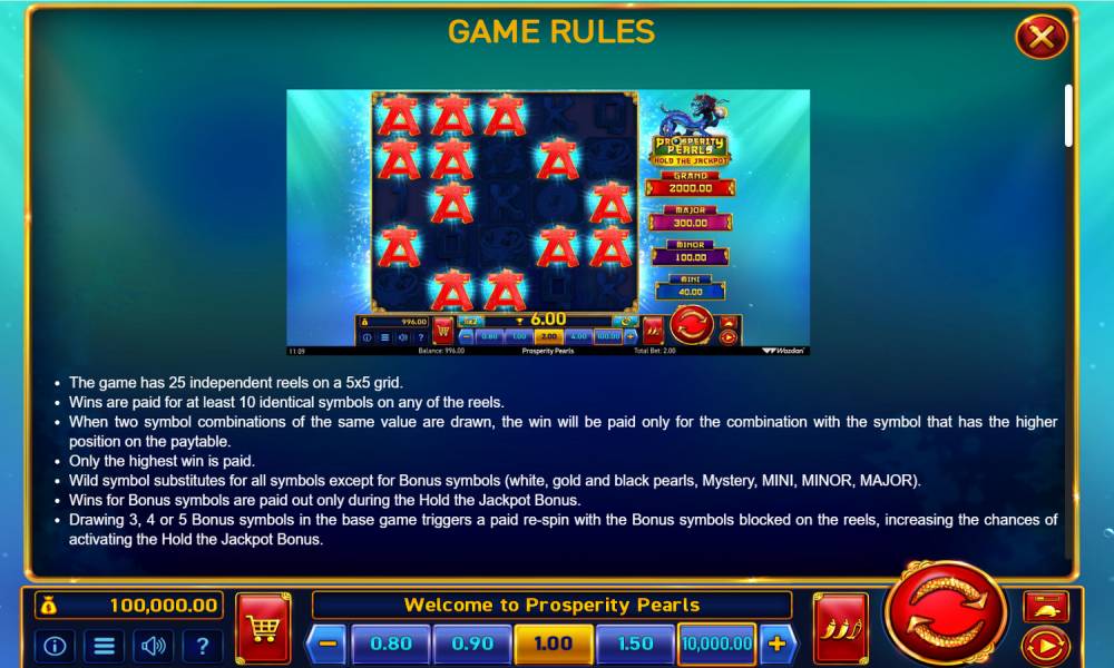 Hold the Jackpot, the activation of this feature occurs when 6 or more white pearls fall out. It offers re-spins where white pearls become sticky on a cleared 5x5 grid, giving you the opportunity to win cash prizes from 1x to 10x of your bet.