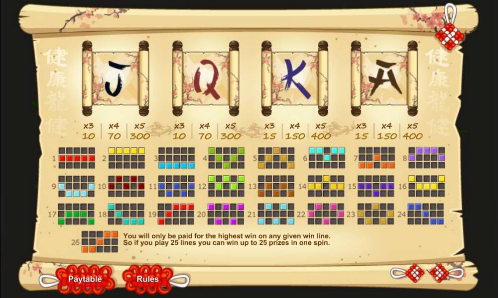 Such symbols as Wild (a white-haired martial arts master), Scatter (a pagoda) and Bonus (a dragon) are provided with advanced functions. Please read about their functions below: