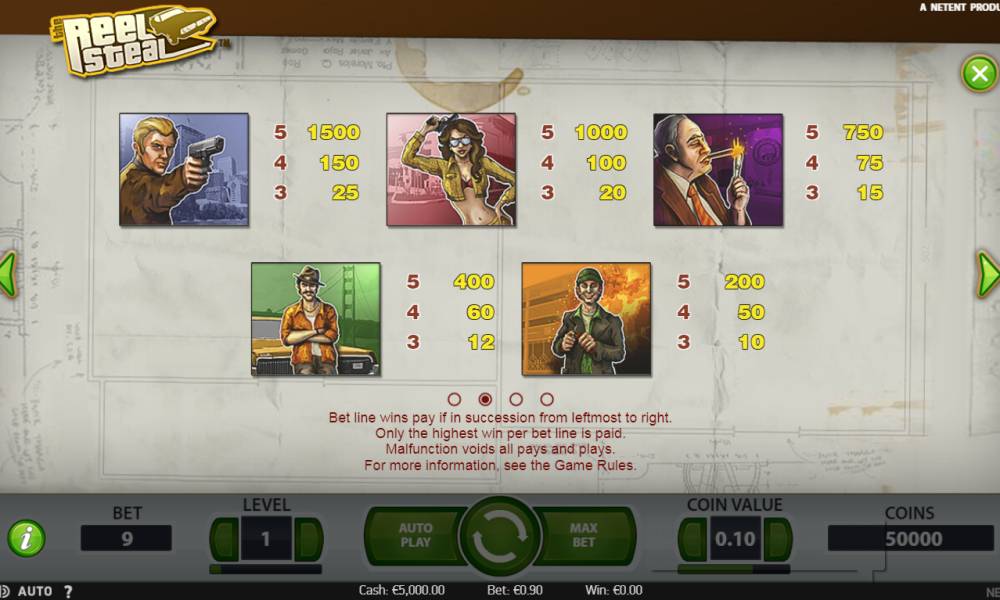 As with many video slots from NetEnt, Reel Steal has all the controls on the main game screen. NetEnt makes it easy to manage your bets and winnings by displaying all relevant information clearly at the bottom of the game screen at the start of each bet. In addition, the high-quality graphics and sound effects make the game even more exciting. For players with slow internet speeds, the option to quickly reduce the graphics quality is available to provide a smoother gaming experience.