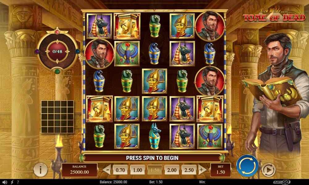 The playing field in the Rich Wilde and the Tome of Dead slot is 5x5. Combinations are made on the principle of clusters with cascading updates. The main condition is that the symbols must touch horizontally or vertically. A minimum of 4 symbols is required for a minimum win. The stake is chosen by the player from the standard range for the provider from 0.1 to 100 euros. Trigger bonuses are not the usual Scatter, but filling the progress bar of rituals. In total, the game has 8 regular symbols and three Wild symbols at once. Freespins are just one round, during which all boosters are activated in turn. The maximum win can reach x5000 of the bet, which is not so bad for the average volatility.