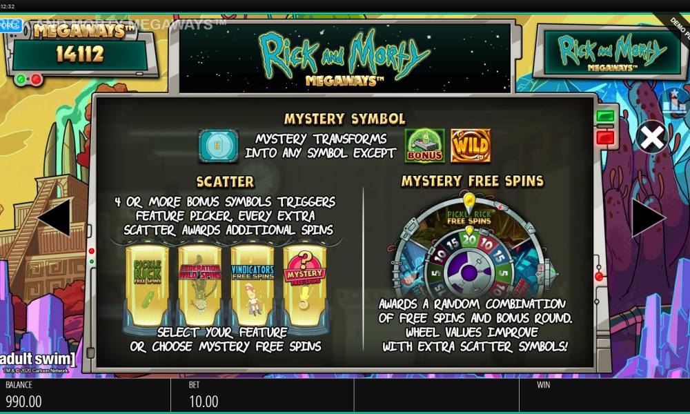| Bonus games | Free Spins, Mystery Symbols, Megaways, Bonus Wheel, Random Wilds, Avalanche, Cascading Symbols, Pickle Rick Free Spins, Federation Free Spins, Vindicators Free Spins, Mystery Free Spins, Symbols collection, Free Spins Mode, Free Spins Multiplier, RTP range, Scatter symbols, Multiway (+1024), Spin The Wheel, Wild |