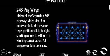 The Riders of the Storm online video slot has five reels and fifteen cells for symbols at the screen. There are no active lines so that the winning chains can be formed in 243 ways by the rules described below.