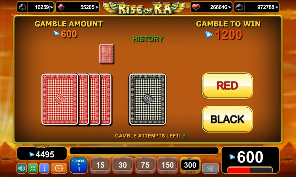 All video slots by EGT, including «Rise of Ra», drawn four progressive jackpots, named after card suits. It is possible to fight for them in a special round, which begins randomly when you play for real money. Twelve face-down cards appear at new spin. It is necessary to pick them randomly, accumulating the suits. As soon as you have three same suits in hand, you win a proper jackpot.