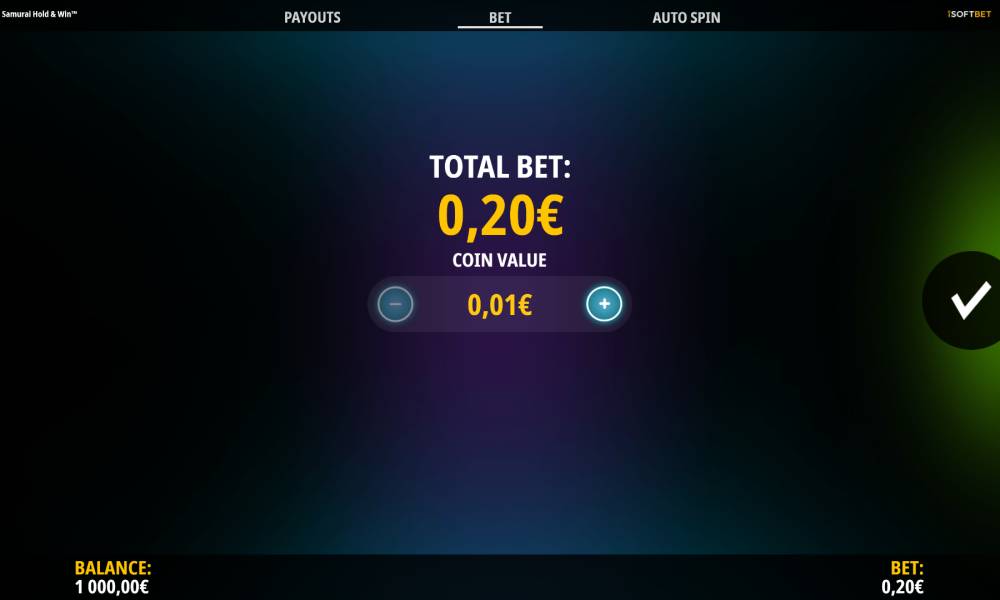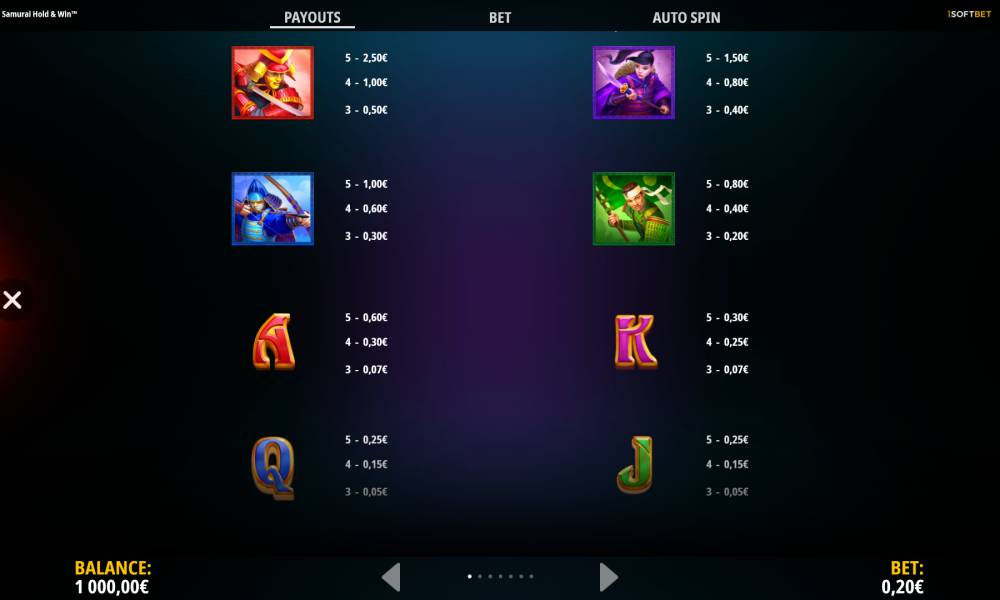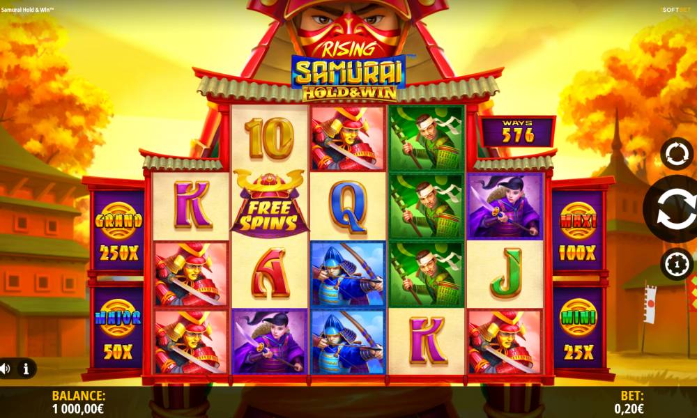 The Rising Samurai: Hold and Win slot machine from the iSoftBet provider has a 3-4-4-4-3 playing field. There are 576 lines and you can’t change them.