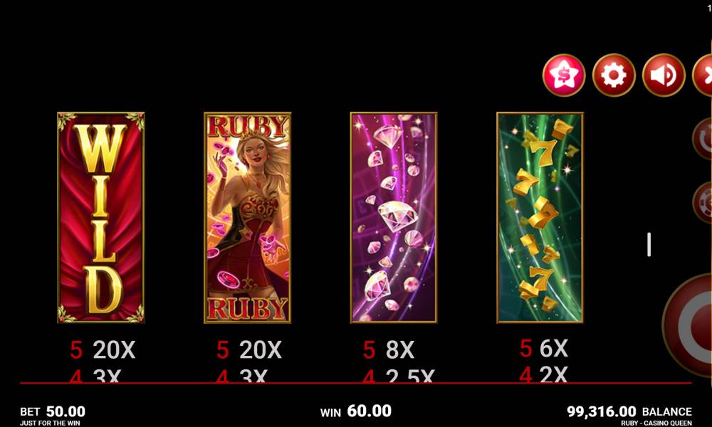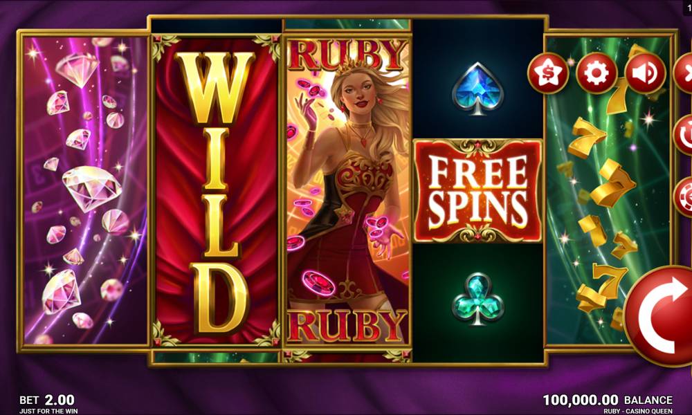 The blonde Ruby appears on the reels wearing a crown and a red dress embroidered with gold. Diamonds, sevens and jewelry in the form of card suits with stones also appear in the columns.