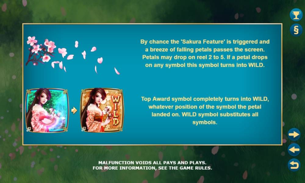 • Sakura Feature may begin during a regular spin under no special terms. Wind blows petals by the screen. They fall at different cells at second-fifth reels. These icons turn into jokers and help making more combinations.