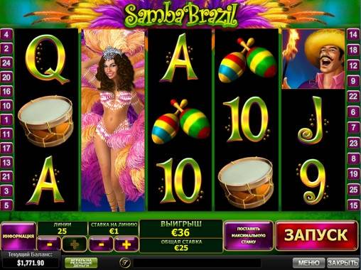 Samba Brazil is a video slot with five reels and numerous gaming functions. Playing this slot machine is possible in range from one to twenty five active lines. The acceptable bet per each of the lines is in range from twenty cents to one hundred euro (by the example of Tropez Casino). Consequently, it is possible to stake up to two thousands euro and a half.