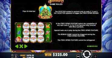 - Scatter (a Christmas tree) is imaged at three central reels. Three Scatters trigger Free Spins Round, but first they bring a payoff in amount of two total bets.