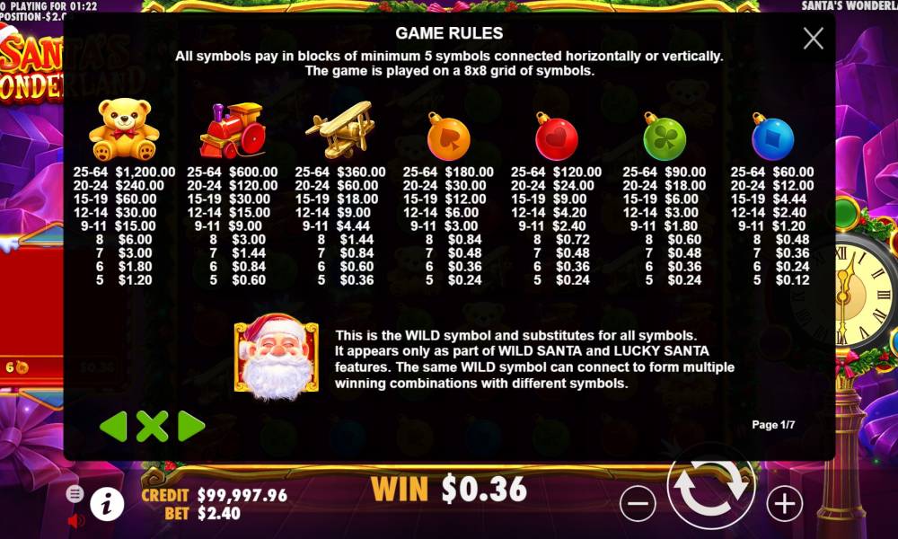 The Santa’s Wonderland slot machine from the Pragmatic Play provider has an 8x8 playing field. Payouts are made on the Cluster Pays system.
