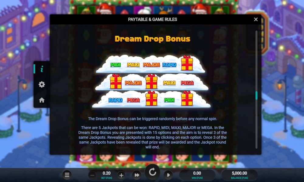 Casinoz experts' conclusions about the Santa's Stack Dream Drop: It's not a bad slot, but it's unlikely to keep you hooked for long. Only 1 bonus feature, which doesn't work very often, and the lack of simple cascades make the spins monotonous. Design and management do not cause complaints, but the gameplay can only like very assiduous and patient gamblers.