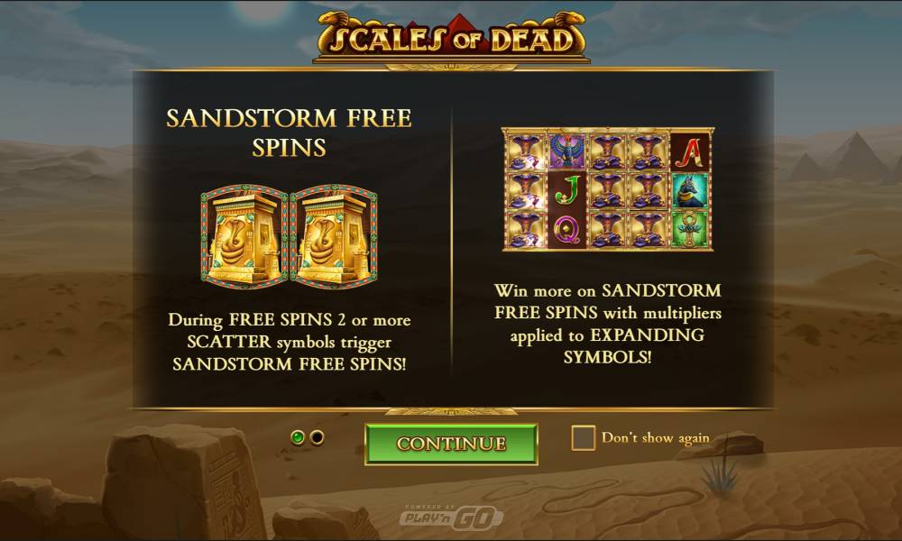 Free spins are activated after 3 Wild Scatter symbols fall. A random Expanding Symbol is assigned before the spins start. If 2 or more Wild Scatter symbols fall during the attempts, the player is awarded Sandstorm Free Spins with multipliers on the Expanding Symbol. A retrigger feature is available, and the player can spin the reels a total of 30 times for free.