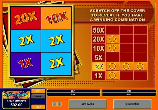 Scratch Card is available at Crazy Vegas Casino and many other online casinos running on software released by Microgaming. You can play it for money and for conditional bets. You can try to play Scratch Card without registration directly on the website Casinoz.