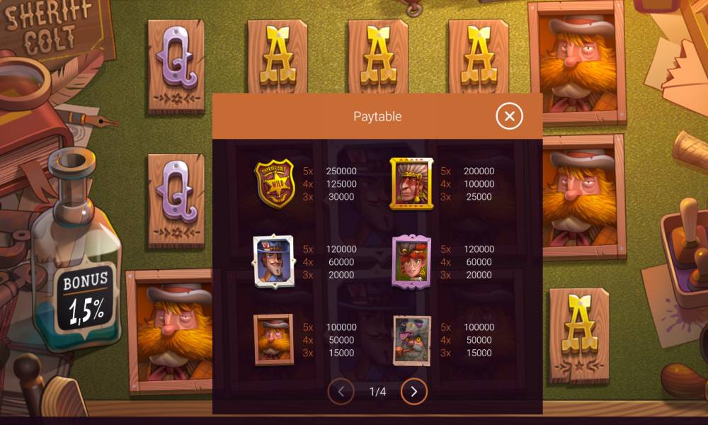 In the online slot Sheriff Colt game field consists of 5 reels and 3 rows, and winning combinations are formed on 10 fixed lines. You need to collect a minimum of three identical symbols to win. Stakes per spin vary from 10 to 10,000 coins, and the maximum winnings reach 5,500x your stake. The slot features sticky Wild symbols, which trigger re-spins, and free spin rounds with 10, 12 or 15 free spins.