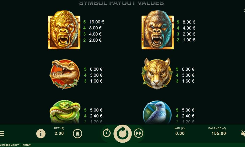 The Silverback Gold slot machine from the NetEnt provider has a standard 5x4 playing grid. Payouts are made on 1024 lines.