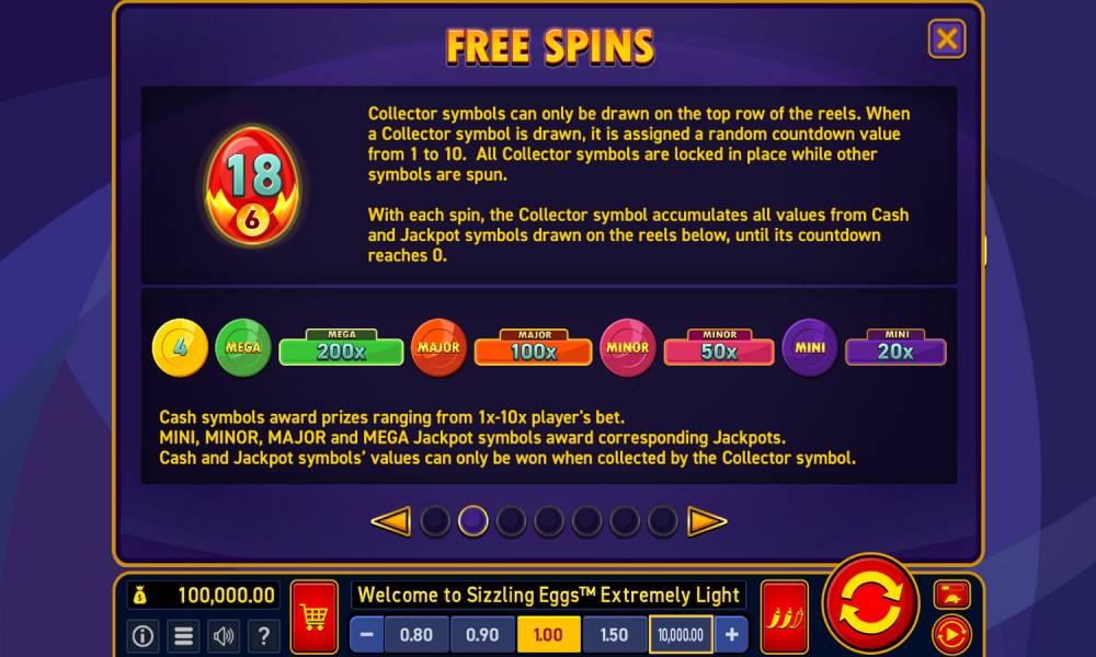 Collector Egg, this is the timed egg on the top row of the reels. This symbol helps to collect values from Cash and Jackpot symbols on the reels below. The egg disappears when the timer goes to zero.