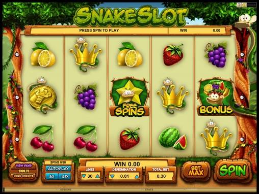 Snake Slot is a beautiful video slot with a nice and funny graphics. The main heroine of the game is a ridiculous snake. Except of it you can see a golden crown, a coin with image of the same snake, a big gem stone, as well as different fruits and berries at the reels of the video slot.