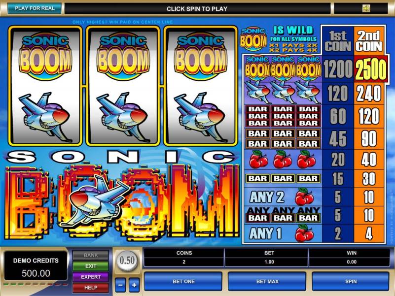 The symbols, which you can see at the reels of Sonic Boom slot machine, are images of a plain, which flies so fast that leaves supersonic trace behind it, as well as cherries, bar stripes, double and triple bars, a plane, as well as a logo of Sonic Boom game.
