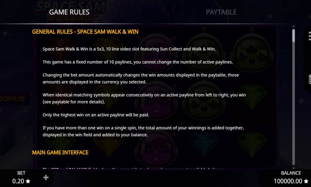 You can learn the rules of the slot in the free demo game. You can start it at any casino where Space Sam Walk & Win is available. Or you don't have to go anywhere else - we've already added the demo mode to this page at the very beginning. This way you can quickly get into practice and make your first spins this very minute.