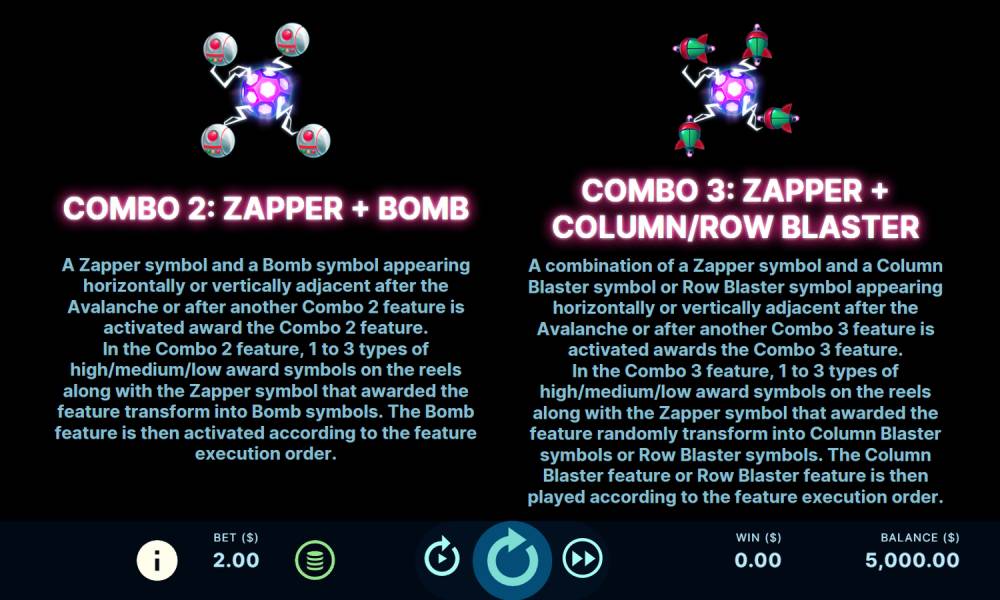 Bomb. Appears when vertical and horizontal payout combinations intersect, if they consist of identical symbols. Explodes and clears the cells around him from simple symbols (special characters remain). Range of action from 3 to 8 cells in all directions.